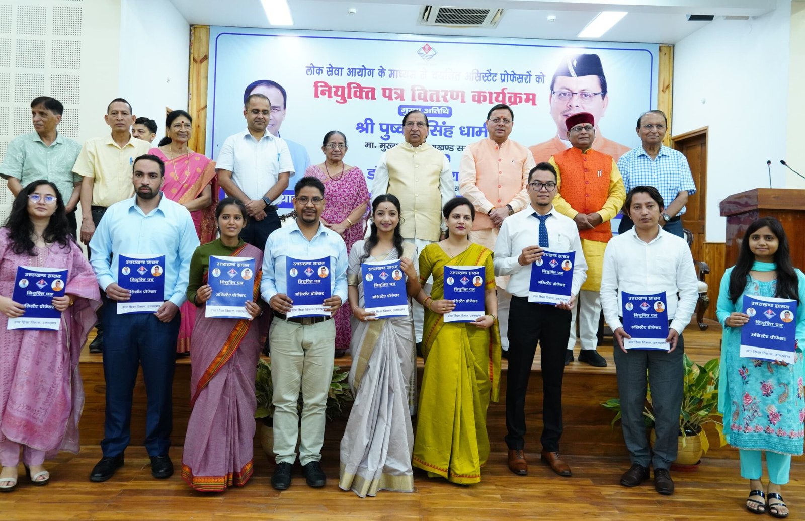 मुख्यमंत्री पुष्कर सिंह धामी ने मंगलवार को मुख्यमंत्री आवास स्थित मुख्य सेवक सदन में उच्च शिक्षा विभाग के अन्तर्गत लोक सेवा आयोग, उत्तराखण्ड से चयनित 72 असिस्टेंट प्रोफेसर को नियुक्ति पत्र प्रदान किये। समाजशास्त्र, अर्थशास्त्र और अंग्रेजी विषय में चयनित असिस्टेंट प्रोफेसर को आज नियुक्ति पत्र प्रदान किये गये। इस अवसर पर मुख्यमंत्री ने राज्य के मेधावी छात्रों के लिए नेशनल इंस्टीट्यूशनल रैंकिंग फ्रेमवर्क (एन.आई.आर.एफ) इंस्टीट्यूट में 50 हजार रूपये की धनराशि प्रदान किये जाने के लिए पोर्टल का शुभांरभ भी किया।