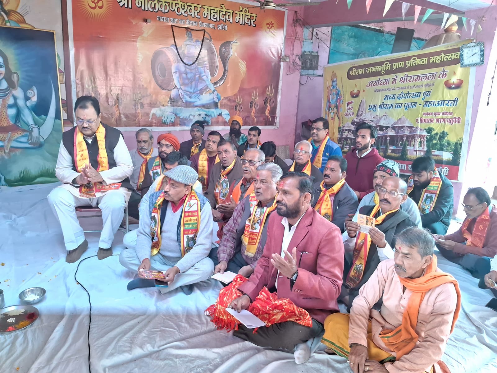 झाँसी। भागवत सत्संग मण्डल एवं गौ सेवा समिति के संयुक्त तत्वावधान में प्रेमनगर नगरा हाट के मैदान में स्थित श्रीनीलकंठेश्वर शिव मंदिर पर अयोध्या धाम में विराजमान श्रीराम लला प्राण प्रतिष्ठा समारोह के प्रथम वर्षगांठ के उपलक्ष्य में 108 श्री हनुमान चालीसा पाठ एवं खिचड़ी प्रसाद वितरण कार्यक्रम मुख्य संयोजक पं.सियारामशरण चतुर्वेदी की अध्यक्षता में सम्पन हुआ। जिसमे सर्वप्रथम प्रभु श्री राम का पूजन अर्चन मुख्य अतिथि पं.मैथलीशरण मुदगिल डारेक्टर मैसर्स बद्रीप्रसाद मुदगिल कॉन्सट्रक्शन झाँसी व विशिष्ट अतिथि रामआसरे गुप्ता,पं.श्यामसुंदर अवस्थी ने किया। व कार्यक्रम का पूजन-अर्चन पूज्य पं.हरिओम थापक जी महाराज ज्योतिषाचार्य,पं.पुष्पेंद्र दुबे जी महाराज,पं.मनोज चतुर्वेदी बालव्यास जी महाराज,पं.रविकांत मिश्र जी महाराज की उपस्थिति में सम्पन हुआ तथा इस अवसर पर मुख्य रूप से ठा.अरुण सिंह,नरेश मिश्रा,इंद्रपाल सिंह खनूजा,दीपचंद्र,बृजेन्द्र श्रीवास्तव,सतीश बाबा,कैलाश नारायण मालवीय,आदेश चतुर्वेदी,विश्वनाथ मिश्रा,चंद्रमोहन तिवारी,नरेश बुंदेला,रमेश चौबे,हरीशंकर शर्मा,ज्ञान सिंह गुर्जर,जयपाल यादव,गोपेश्वर सोनी,वीरू,चप्पू,मयंक,अवधेश,सौरभ,रानू महाराज सहित आदि लोग उपस्थित रहे।