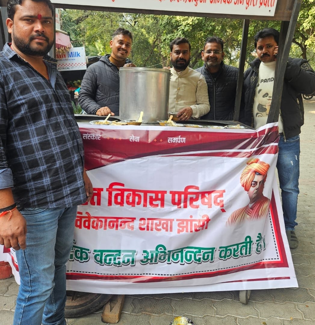 झांसी। मकर संक्रांति के अवसर पर भारत विकास परिषद् विवेकानन्द शाखा के तत्वावधान एवं अध्यक्ष सौरभ जैन सर्वज्ञ के नेतृत्व में मेडिकल कॉलेज के प्रांगण में सामाजिक समरसता का प्रतीक खिचड़ी भोज आयोजित किया गया जिसमें मरीजों, तीमारदारों एवं आम राहगीरों को खिचड़ी वितरित की गई। इस अवसर पर संस्था के संरक्षक वरुण जैन, उपाध्यक्ष एंजी. विकल्प जैन, कोषाध्यक्ष सजल जैन चैनू, परनतप शर्मा, गौरव चौधरी, अंशुल जैन, गौरव जैन नीम, अंकित शर्मा आदि उपस्थित रहें।