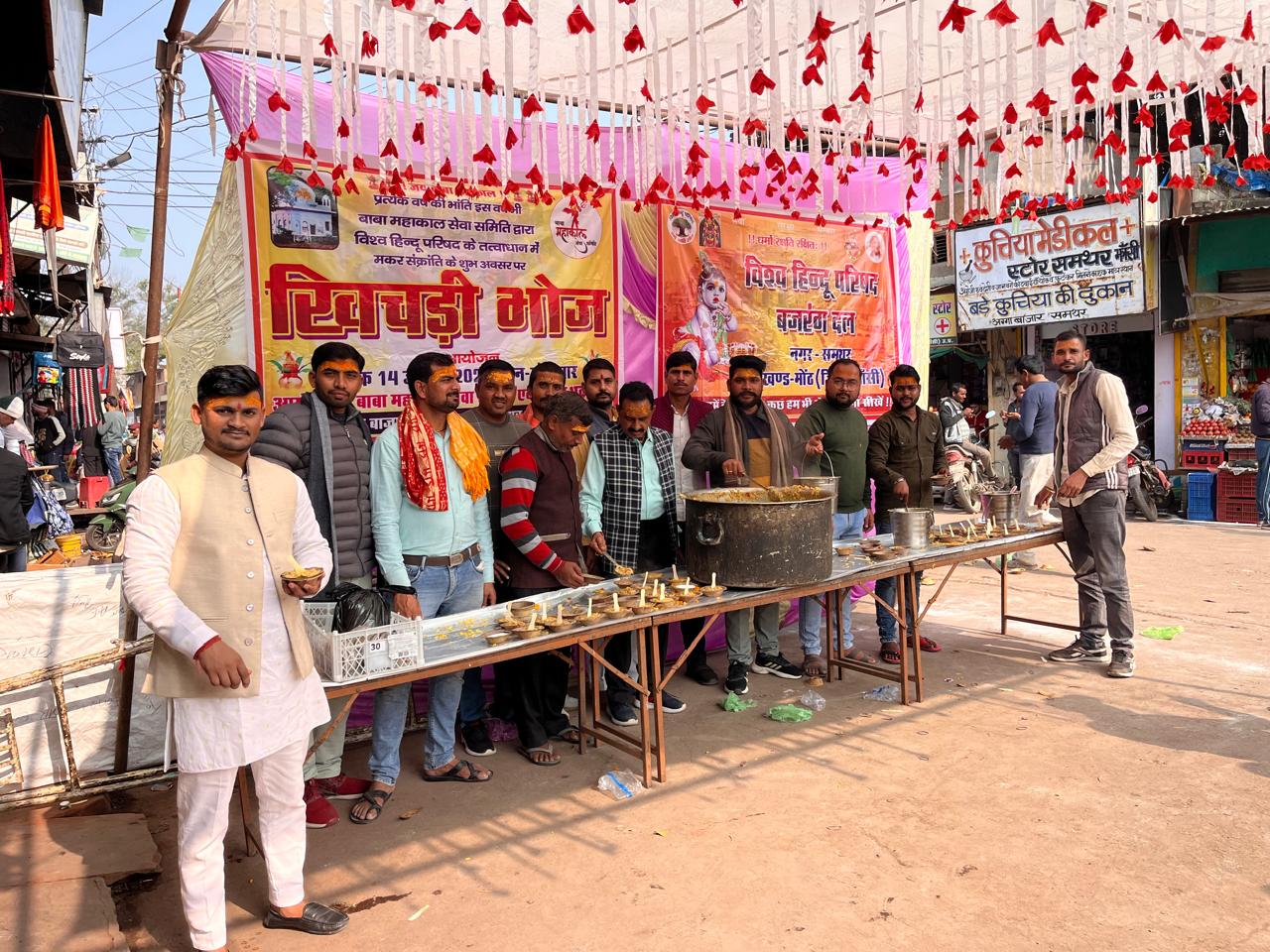 समथर(झांसी)। नगर के अग्गा बाजार चौराहे पर बाबा महाकाल सेवा समिति, विश्व हिन्दू परिषद एवं बजरंग दल के कार्यकर्ताओं द्वारा खिचड़ी भोज का आयोजन किया कार्यक्रम में नगर व क्षेत्र के हजारों लोग सम्मलित हुए।जिला सेवा प्रमुख विश्व हिन्दू परिषद भरत शरण मोनू नगाइच ने बताया कि बाबा महाकाल सेवा समिति जोकि एक धार्मिक व सामाजिक संस्था है समिति द्वारा पिछले कई वर्षों से मकर संक्रांति पर खिचड़ी भोज का आयोजन किया जाता है इस वर्ष भी खिचड़ी भोज का कार्यक्रम सम्पन्न हुआ।समिति द्वारा वर्ष में लगातार कई धार्मिक,सामाजिक कार्यक्रम सम्पन्न होते रहते है।कार्यक्रम के शुभारम्भ में श्री गणेश जी,बाबा महाकाल एवं कन्याओ का विधि विधान से पूजन किया गया तत्पश्चात प्रसाद (खिचड़ी) वितरण किया गया। इस अवसर पर रोहित सविता(नगर अध्यक्ष विहिप), नितिन गुप्ता (कोषाध्यक्ष), मोती रायकवार, दीपक राना, पारस व्यास ( जिला सह संयोजक बजरंग दल), मोंटू महाराज पहाड़पुरा,चिराग नामदेव, आशीष उपाध्याय (जिला सह धर्माचार्य विहिप), चंद्रशेखर बघेल,मनीष राना, अनुज दुबे, शुभम त्रिपाठी, अवधेश अग्रवाल, राजेंद्र पाल, सौरभ नगाइच,सौरभ नामदेव, धर्मेंद्र तिवारी, कार्तिक नगाइच, सुनील सोनी, टुंडे राइन, ऋषि राना, आशुतोष राजपुरोहित, सरनाम कुशवाहा, प्रशांत व्यास, ओमप्रकाश चंदेल, वीरू साहू, कपिल महाराज, मुन्ना दुबे, कमलेश दुबे, मयंक तिवारी, ऋषभ दुबे, कुलदीप प्रजापति (जिलाध्यक्ष प्रजापति समाज), रोहित उदैनिया, उत्कर्ष व्यास, आत्माराम पाण्डेय, बबलू गुर्जर, आशीष गुर्जर,लवजी गुर्जर, दिलीप दुबे, हरिशंकर पाल, ऋषभ लक्षकर, अभय चौहान, अभय चौहान, मंगल यादव, राजेश, मनोज पावानी, मनीष कुचिया, रिंकू व्यास, अरविन्द साहू, डॉ अभय गुप्ता, राजकुमार कुशवाहा, राघव कुचिया, शिवम् मुदगिल खिरिया, रामनारायण सेन, आदि उपस्थित रहे, राज नगाइच,किशन तामोटिया।