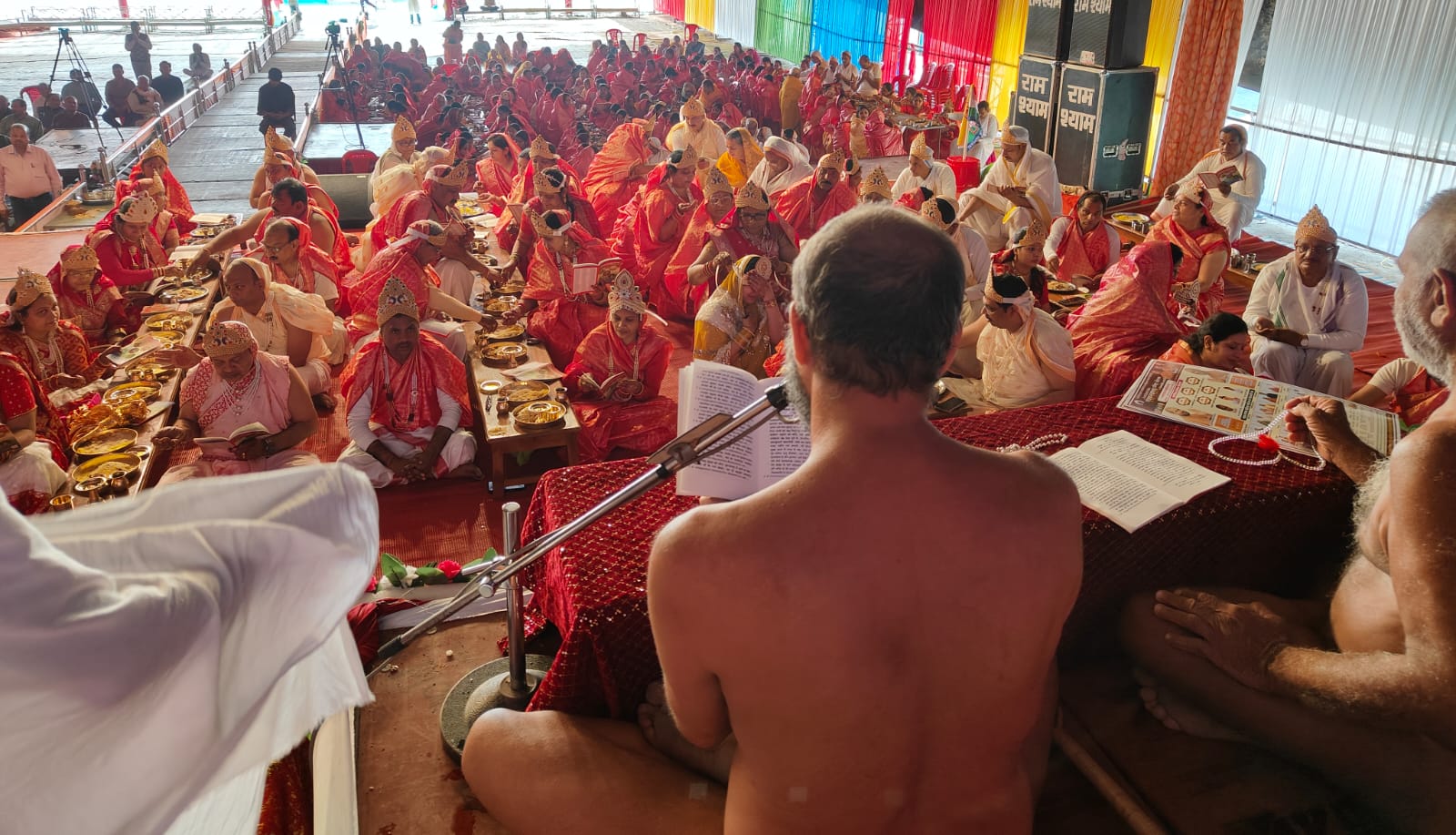 झांसी। महानगर के बड़ागांव गेट बाहर सूंजे खां खिड़की मार्ग स्थित चावला कॉलोनी के पास बनी अयोध्या नगरी में चल रहे श्री मज्जिनेन्द्र जिनबिम्ब पंचकल्याणक प्रतिष्ठा महोत्सव में मुनिश्री विलोकसागर जी महाराज एवं मुनिश्री विबोधसागर जी महाराज के सानिध्य एवं प्रतिष्ठाचार्य बाल ब्रह्मचारी संजय भैया जी मुरैना एवं बाल ब्रह्मचारी नवीन भैया जी जबलपुर के निर्देशन में गर्भकल्याणक की मांगलिक क्रियाएं एवं पूजन सम्पन्न हुई। प्रातः श्रीजी के मस्तक पर शांतिधारा करने का सौभाग्य मुकेश नायक चिरगांव, राकेश सिंघई को प्राप्त हुआ। तीर्थंकर के माता पिता श्रीमति सुलेखा – मनोज नायक, सौधर्म इंद्र श्रीमति उषा – रविन्द्र सिंघई, कुबेर इंद्र श्रीमति श्वेता – नितिन जैन, भरत चक्रवर्ती श्रीमति पूनम – संजीव जैन मिनी चिरगांव, महायज्ञनायक श्रीमति कल्पना – अरविन्द जैन कामरेड, बाहुबली श्रीमति कनिका – शशांक जैन, यज्ञनायक श्रीमति प्रिया – प्रतीक जैन, ईशान इन्द्र श्रीमति ममता – जितेन्द्र चौधरी, सानतकुमार इन्द्र श्रीमति रश्मि – गौतम जैन (सुपाड़ी), माहेन्द्र इन्द्र श्रीमति मेघा,- प्रदीप जैन महरौनी, राजा श्रेयांस श्रीमति सुलोचना – सनत नायक, राजा सोम श्रीमति प्रियंका – अमरेन्द्र ड्योढिया, महामंडलेश्वर श्रीमति अनीता – इंजी.अनिल जैन, श्रीमति नेहा – अलंकार जैन, श्रीमति अंजू – रवींद्र जैन रेल्वे, श्रीमति प्रभा – दिनेश जैन दीनू, विशेष इंद्र श्रीमति सविता – विनोद जैन ठेकेदार, श्रीमति मनीषा – मनोज सिंघई, श्रीमति निकिता – सजल जैन चैनू, जिनेन्द्र जैन शामयाना, लहर जैन, वीरेन्द्र चौधरी, रमेश चंद्र जैन बिजली, दिव्यांश जैन, भगवानदास जैन, पवन जैन सतभैया, जितिन जैन अछरौनी, यश सिंघई, मंडलेश्वर राजा मुकेश जैन वीडियो , दीपक जैन, पदम चंद जैन रानीपुर, प्रिंस जैन, जिनेन्द्र जैन बंगलाघाट, सौरभ जैन महरौनी, सीए रूपाली जैन, आरती जैन, मेघा जैन सहित अनेकों इन्द्र इंद्राणियों ने गर्भ कल्याणक की मांगलिक क्रियाएं करते हुए पूजन सम्पन्न की। इस अवसर पर वहीं सांयकाल सांस्कृतिक कार्यक्रमों में सौधर्म इंद्र का दरबार एवं माता मरुदेवी के सोलह स्वप्नों को दिखाया गया। जिसका फलादेश महाराजा नाभिराय ने बताया। मंगलाचरण श्रीमति ऐना जैन एवं आकृति जैन ने प्रस्तुत किया। सायंकालीन महाआरती का सौभाग्य सुधीर जैन, रविन्द्र जैन, संजय जैन, राजीव जैन (चिरगांव परिवार) को प्राप्त हुआ। पंचकल्याणक प्रतिष्ठा महोत्सव समिति के मुख्य मार्गदर्शक अजित जैन, अध्यक्ष संजय सिंघई, कार्याध्यक्ष खुशाल जैन, मुख्य संयोजक दिनेश जैन डीके, कार्यक्रम संयोजक विनोद जैन ठेकेदार, परम संरक्षक हुकुमचंद जैन, मुख्य सलाहकार रमेश चंद्र जैन अछरौनी, जिनेन्द्र सर्राफ, प्रदीप जैन चैनू, 