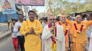 झांसी। अंतर्राष्ट्रीय कृष्ण भावनामृत संघ द्वारा विगत वर्षों की भांति इस वर्ष भी भगवान श्री चैतन्य महाप्रभु का जन्मोत्सव बड़े ही धूम धाम के साथ मनाया जा रहा है। महोत्सव का शुभारंभ भव्य हरिनाम संकीर्तन शोभा यात्रा के साथ हुआ, जो कचहरी चौराहा से शुरू हुई। मंदिर अध्यक्ष ब्रजभूमि दास जी के नेतृत्व में निकली संकीर्तन यात्रा का सदर बाजार में भ्रमण के दौरान श्रद्धालुओ व व्यापारियों ने जगह-जगह स्वागत किया। इस्कान मंदिर में चार दिवसीय श्री चैतन्य महाप्रभु कथामृत का शुभारंभ मॉरीशस से पधारे परम पूज्य सुन्दर चैतन्य स्वामी ने किया। प्रवचन दिये। कथा उपरांत प्रसाद वितरण किया गया। इस अवसर पर मंदिर के प्रमुख सहयोगी भक्तगणकरुणा सिंधु प्रभु, सुरेंद्र राय,महेश सराफ,राजीव अग्रवाल,अशोक सेठ, मनीष नीखरा,रमेश राय ,अशोक गुप्ता ,अजय अग्रवाल, व्रज जन रंजन दास, दामोदर बंधु दास, सुन्दर मोहन दास, आदि उपस्थित रहे।शोभा यात्रा का संचालन पियूष रावत ने वह आभार व्यक्त किया मुकेश सिंघल ने !