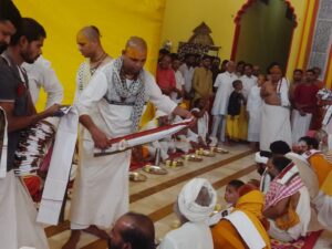 इससे पूर्व प्रात:कालीन बेला में यज्ञाचार्य अतुल लिटौरिया एवं उप यज्ञाचार्य रामनरेश लिटौरिया, पं.मधुसूदन तिवारी, पं .प्रकाशचंद्र उदैनिया,पं.योगेश मिश्रा,पं.पवन पाठक एवं पं. सिद्धगोपाल द्विवेदी ने विधि विधान से वेदिका पूजन कराया तदुपरांत यजमान श्रीमती विभा मृदुल तिवारी,ममता अजय अग्रवाल, दीर्घा विजय चौधरी, गीता राजेंद्र अग्रवाल, मुस्कान धीरज कुशवाहा, रमा आशाराम कुशवाहा, राजेश्वरी कोमल सिंह सिजरिया, जयकुंवर लालाराम कुशवाहा, सुनीता रामसिंह, फूलवती बृजमोहन साहू,रज़नी मारुति दीक्षित एवं गिरवरधारी जू मंदिर के पुजारी मदनमोहन दास एवं श्रीधामवृंदावन से राधाबल्लभजी,स्वामी देवेंद्र वशिष्ठ के साथ महाराजश्री राधामोहन दास ने पूर्णाहुति कर यज्ञ सम्पन्न कराया।