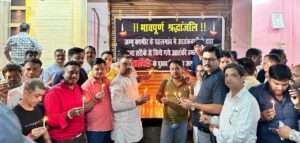 सर्राफा बाजार, दीक्षित बाग व्यापार मंडल झांसी ( रजि ) के तत्वाधान में आज झांसी सराफा बाजार में जम्मू कश्मीर के पहलगांव में आतंकवादियों द्वारा कायराना तरीके से किए गए आतंकी हमले में मारे गए हिंदू सैलानियों के दुखद निधन पर केंडल मार्च निकाल कर आश्रुर्पूर्ण श्रद्धांजलि अर्पित की गई