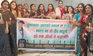 झांसी आज पुलवामा शहीद दिवस पर उत्तर प्रदेश महिला व्यापार मंडल महानगर शाखा द्वारा महानगर अध्यक्ष माला मेहरोत्रा के नेतृत्व में 14 फरवरी 2019 को जम्मू-कश्मीर के पुलवामा में हुए आतंकी हमले में 40 सीआरपीएफ जवान शहीदों को अपनी श्रद्धांजलि व्यक्त करते हुए मोमबत्ती जलाकर शहीदों को अपने श्रद्धा सुमन अर्पित किए !
